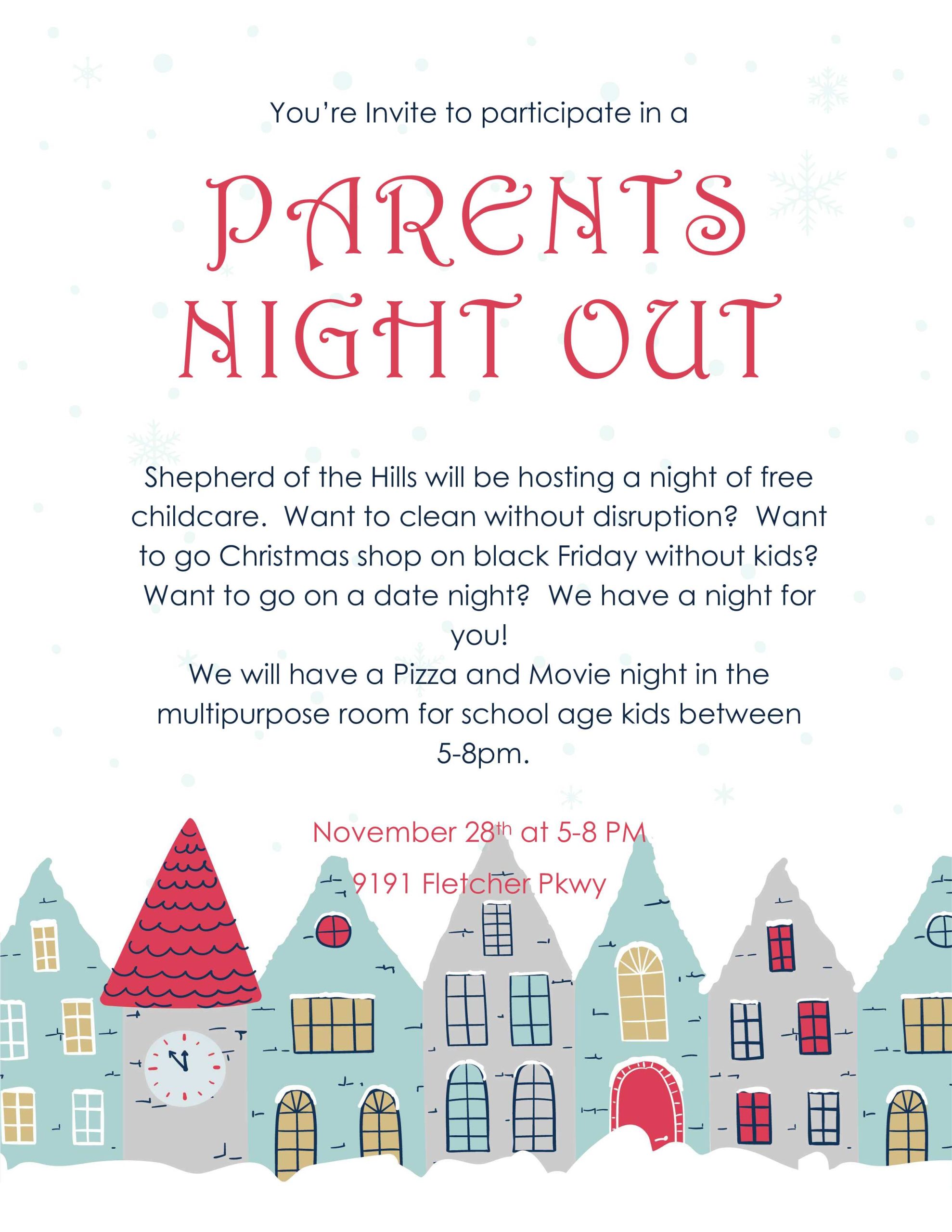 On the flyer above, you will find some information for a Parent’s Night Out. This is available for parents to spend some time together without their kiddos. If you plan on taking advantage of this, please RSVP to Kristen Barnes at 818-601-2798.